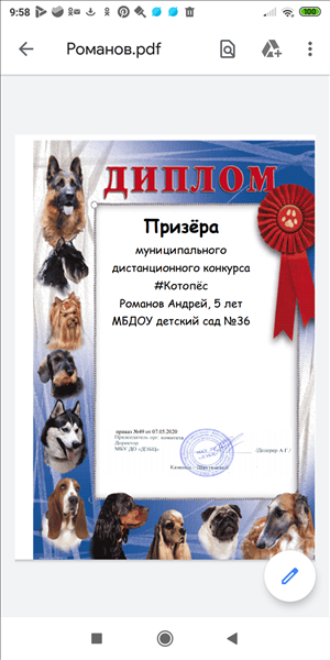 | Муниципальный конкурс "Котопёс" | Муниципальный уровень | 23.04.2020 | 07.05.2020 | Призер | Файл (JPG; 195Кб) | Файл (JPG; 195Кб) |
